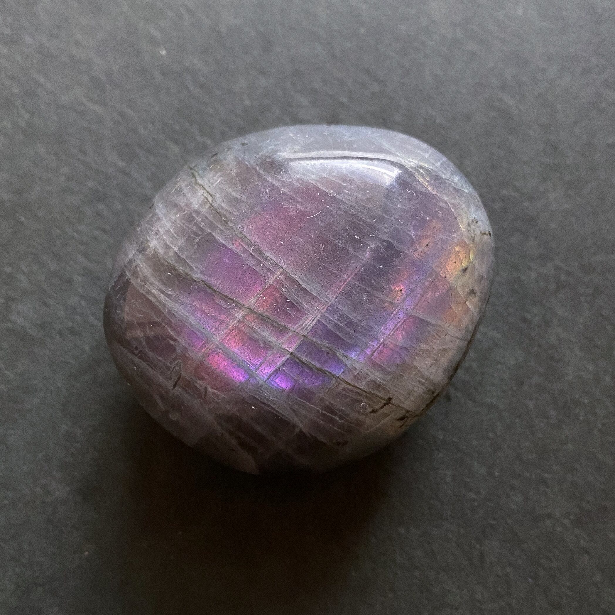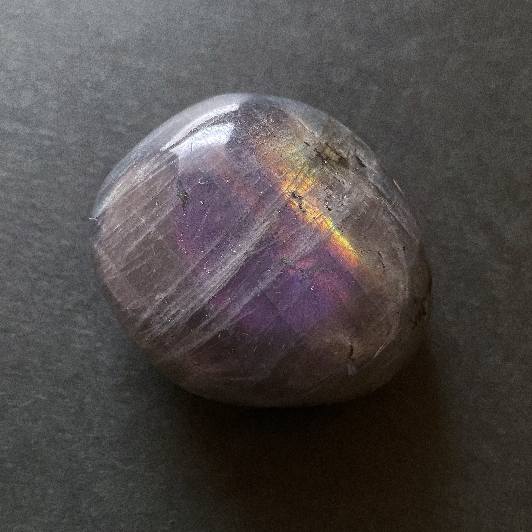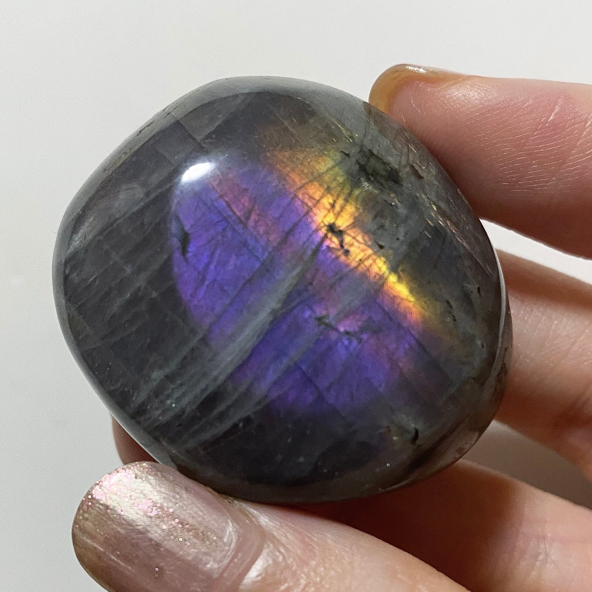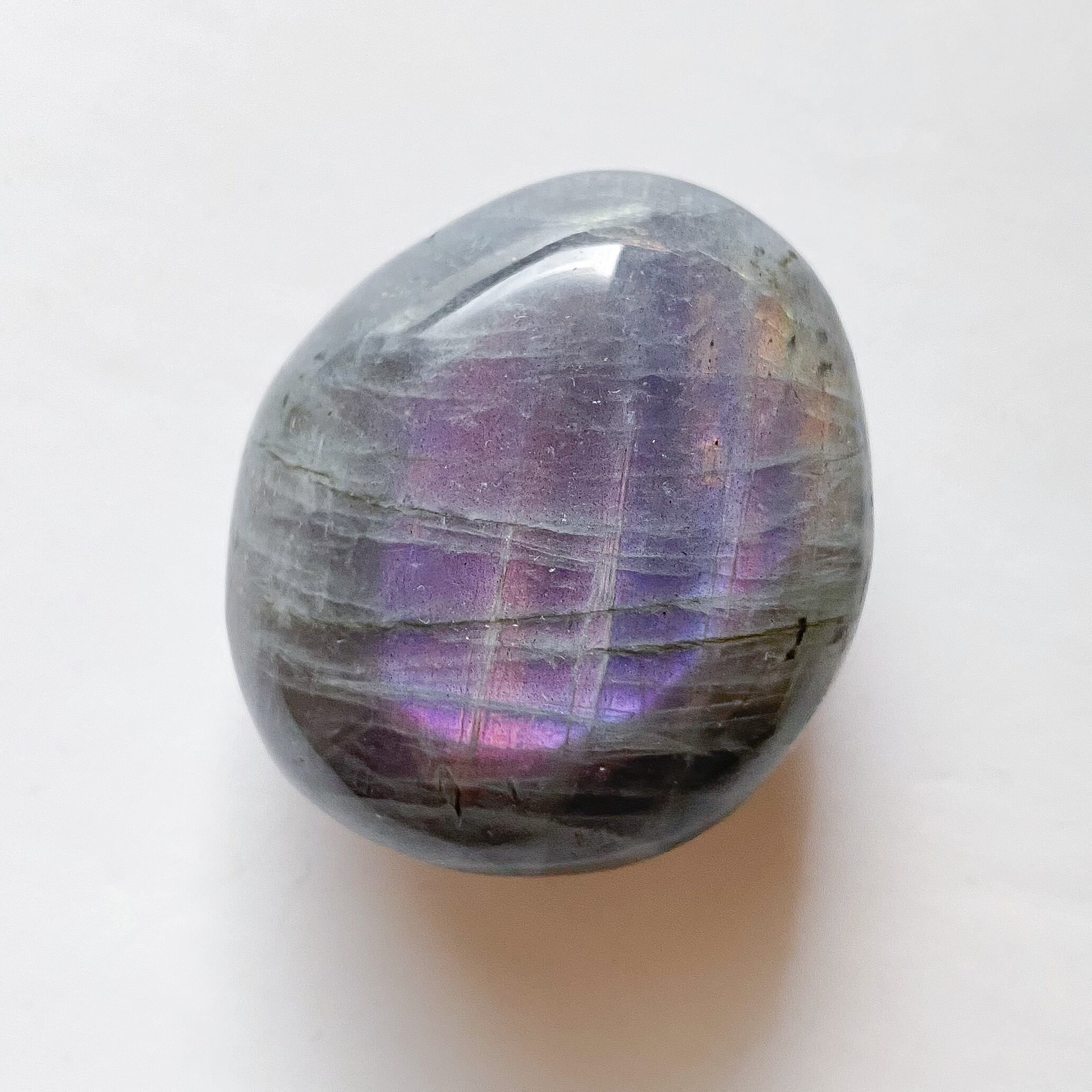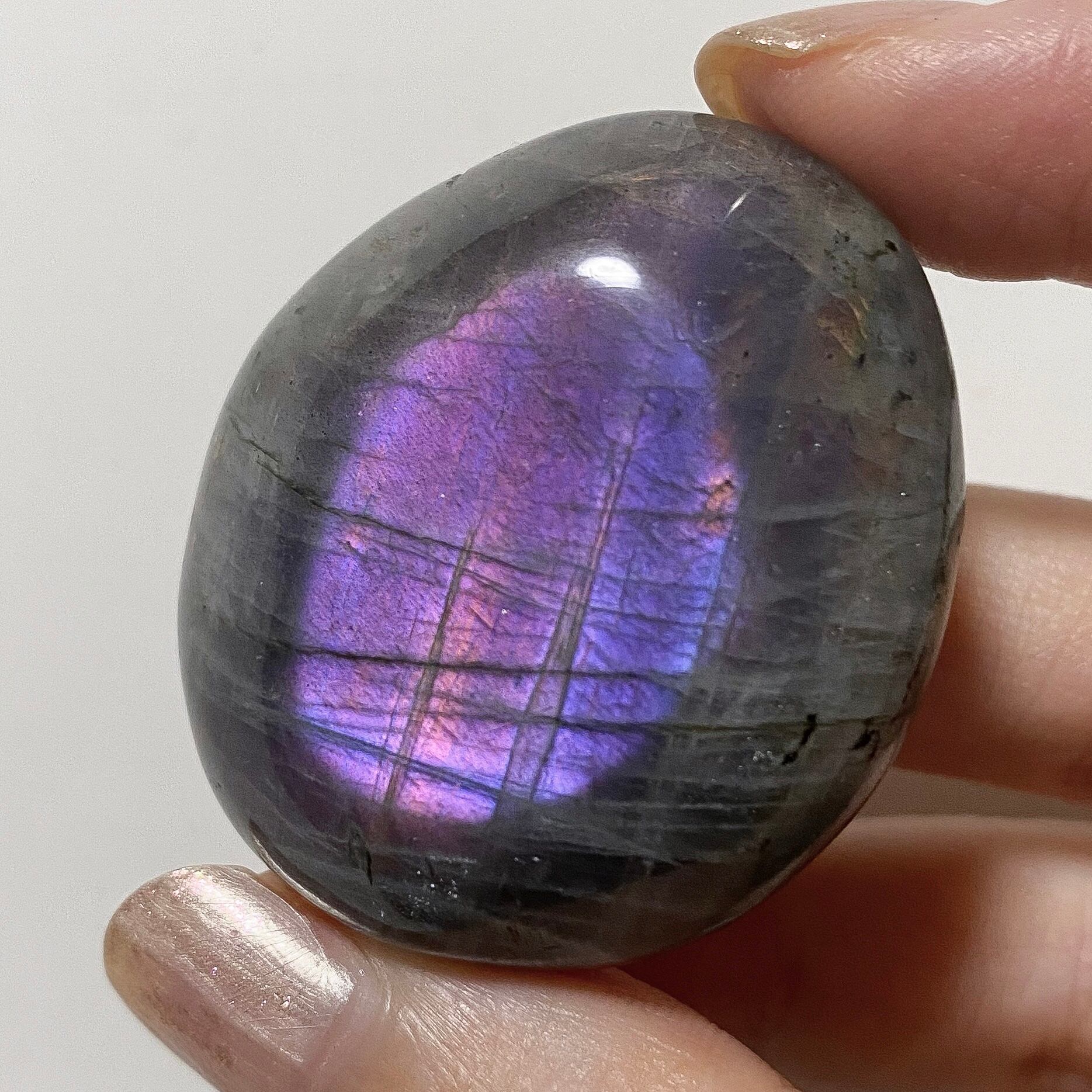 両面共にパープルカラーのシラーで、シラーの入る角度も良いです。こちらもパームストーン1と同様、シラーの見えない角度からはキラキラとしたラメ状の輝きも見られる良質のラブラドライトです。
