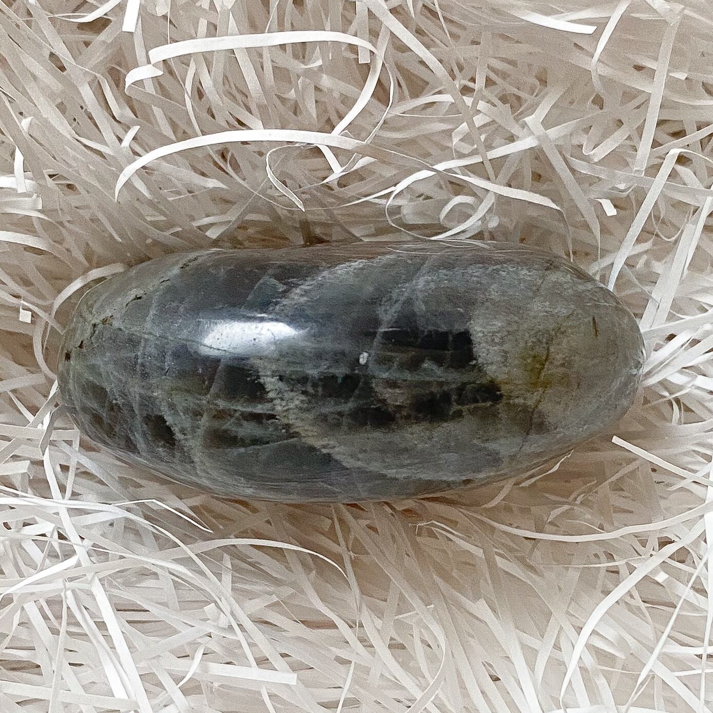 地色が灰〜黒色で、内部にラブラドレッセンスと呼ばれるシラーの層を持ちます。シラーの色は多彩で青色、虹色、ピンク、紫と様々です。