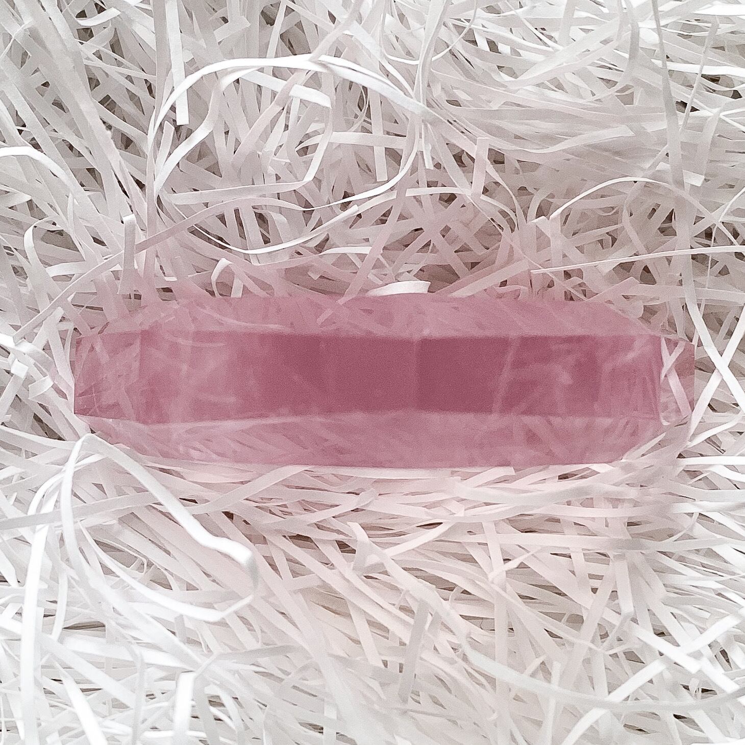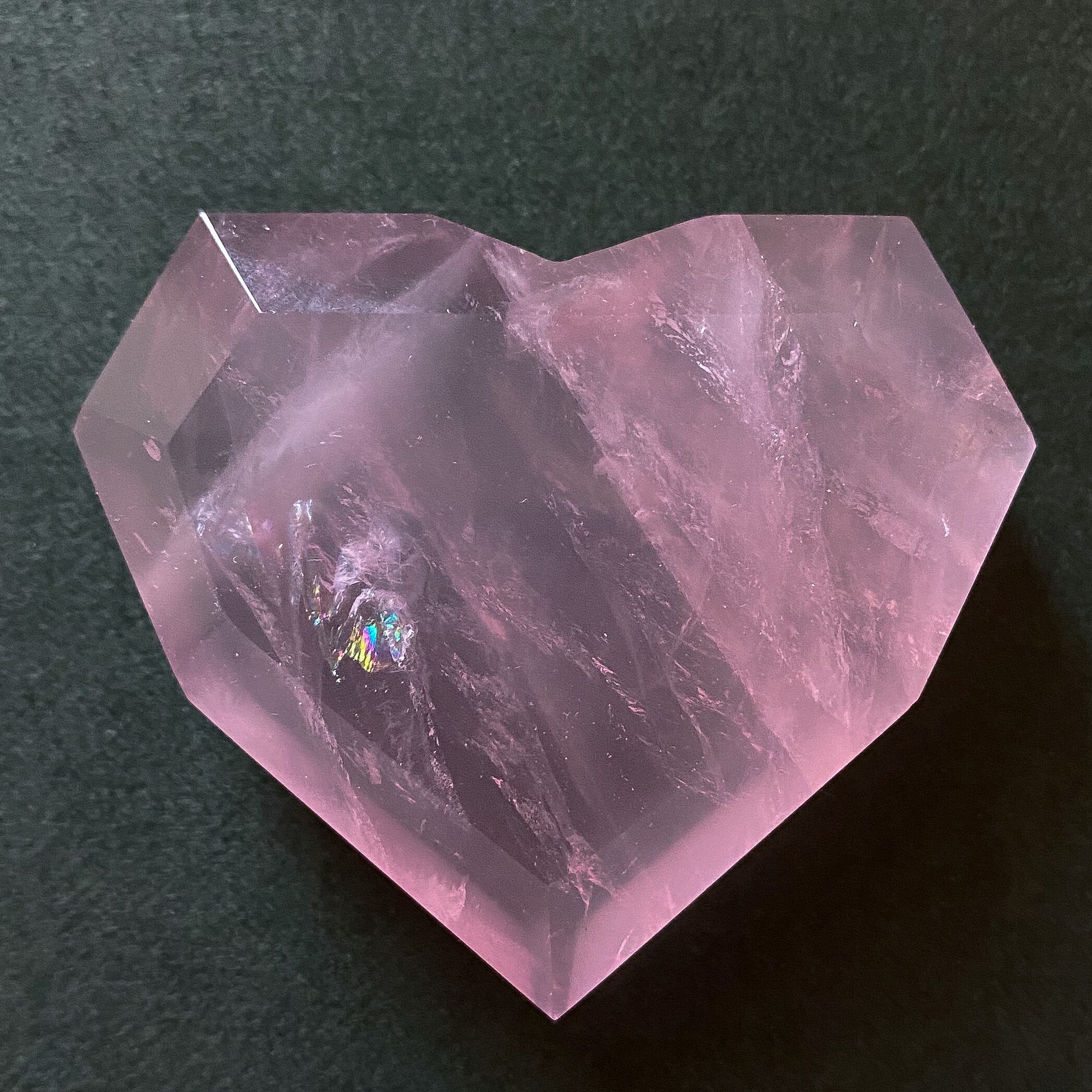 マダガスカル産らしいディープカラーのローズクォーツです。全体的に青みのピンクカラーで、こちらは濃い色味ながら透明感もあり正面に入る虹が目を惹きます。